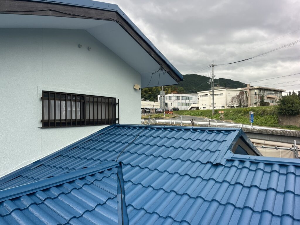 | 屋根施工仕様 | 【工程】上塗り1・上塗り2(シーラーレス) 【上塗り材】大同塗料 ハイウーフマイルドシリコン遮熱型 【使用色番】870 ナイスブルークール |